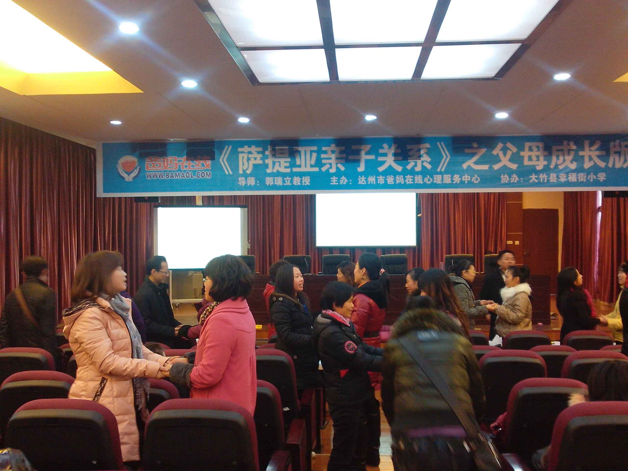 2011年12月17至18日達州市爸媽在線心理服務中心為“爸媽幸福工程”親情打造的特色親子課堂在大竹縣幸福街小學成功舉辦。在本次課程培訓班上,有來自萬州、南充、達州、大竹等100余名學員,通過兩天的緊張學習,系統
