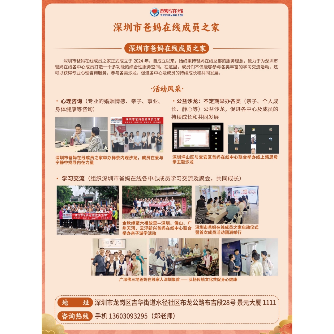 深圳市爸媽在線成員之家正式成立于2024年。自成立以來,始終秉持爸媽在線總部的服務理念,致力于為深圳市爸媽在線各中心成員打造一個多功能的綜合性服務空間。在這里,成員們不僅能夠參與各類豐富的學習交流活動,還可以獲得專業心理咨詢服務,參與各類沙龍,促進各中心及成員的持續成長和共同發展。